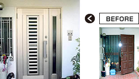 リフォーム用玄関ドアに入れ替えしました。 元の玄関ドア枠を下地として使うので、撤去・復旧手間が少なく費用が安い上に綺麗に納まりました。 採風タイプなので、うっとうしい後付玄関網戸が必要なく、玄関回りがスッキリしました。